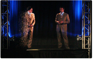 The 3D Holographic Stage System incorporates a ‘performer’s stage’ that is equipped with state of the art LED lighting and is usually boxed with hard paneling or dark draping along the sides and back of the system. The Holographic screen sits on a 45˚ angle between the stage and the audience and at least one high powered, high definition video projector is mounted in front of the foil, projecting onto either the floor or ceiling depending on foil orientation. Live or pre-recorded shows can be shown on the 3D Holographic Stage unit.